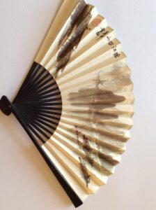 Hello, greetings from the UK. I inherited this fan and have been trying to learn more about the fan, the signature, age and full translation of the kanji. I believe the fan is Chinese and likely to be over 50 years old. A Japanese friend thought it includes 雪→snow 雨→rain 江→mouth of river 澪→waterways n the calligraphy, but I would love to know more. Kindest regards