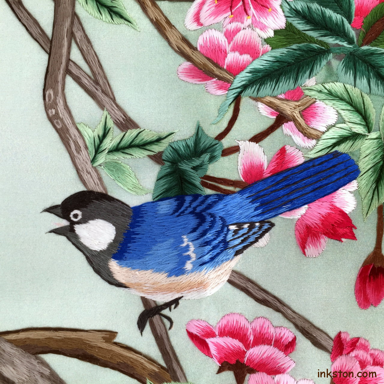 El panel frontal presenta una escena en seda bordado. El bordado llena la superficie con un par de pájaros carbonero común (Parus Major) en ramas con flor de melocotonero rosado. Todo cosido a mano y muy detallado.