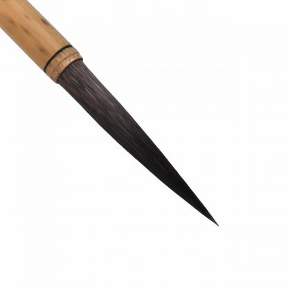 I wanted to see how a brush of this size and unusual length would work with cursive calligraphy. At it’s best, this brush is wonderful for very small cursive characters. The stiffness works nicely and is responsive. It’s more of a challenge to get a much thicker line since using the brush up higher in the bristles tends to spread the thick hairs and lets in dry spaces. However, this is expected in a brush styled like this and can make for interesting variety in strokes. I am using this brush primarily for signatures on calligraphy work and for small character cursive. Excellent construction and quality.