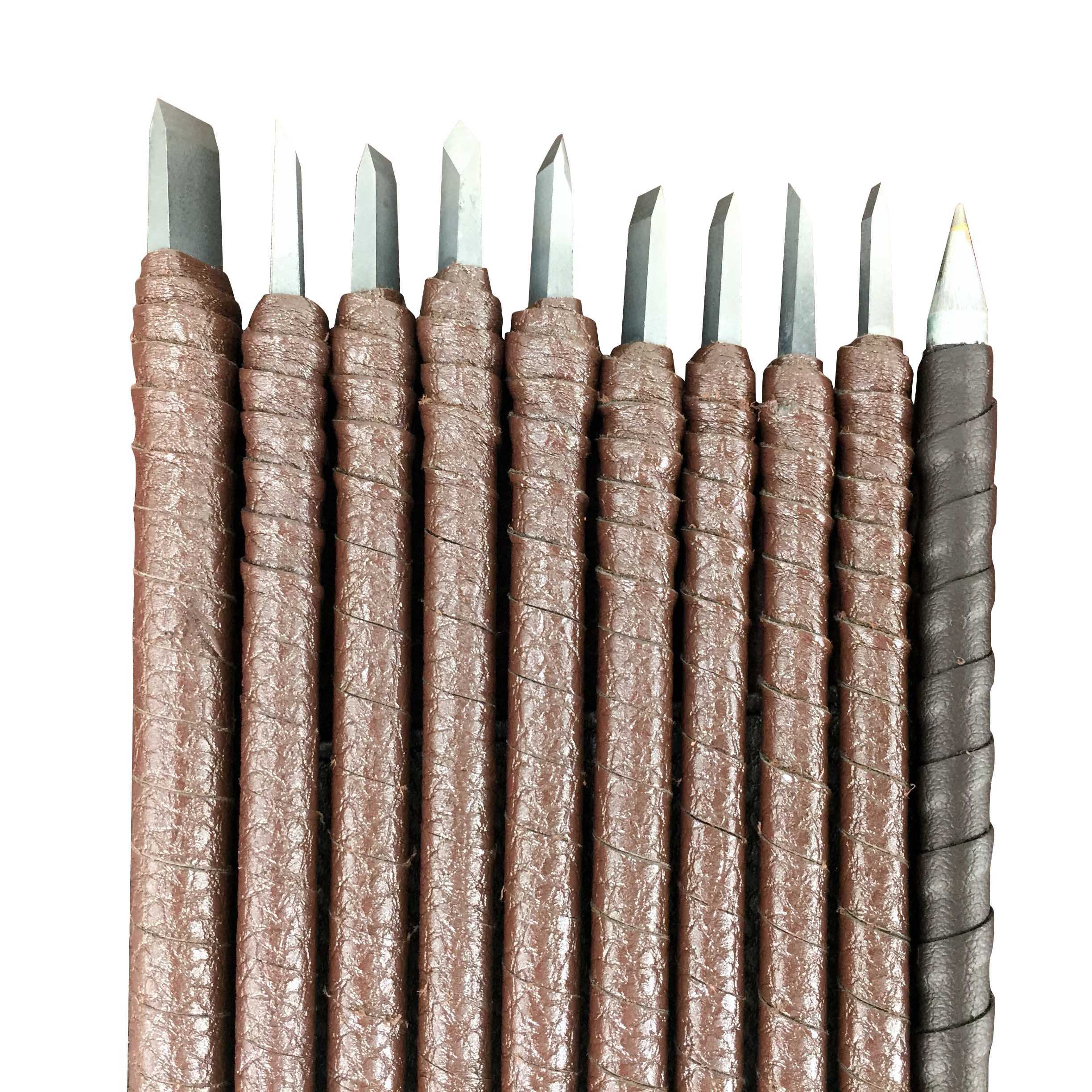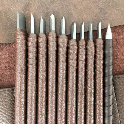 A set of 10 fine chisels to carve seals. Compared to the chisels mostly seen in market, these chisels have thicker and the edges are shorter. Thicker and shorter blades is stronger and less easy to get damaged compared to normal thin blades. At the same time, chisels with thick blades are more expensive than thin blades since it requires more good materials.