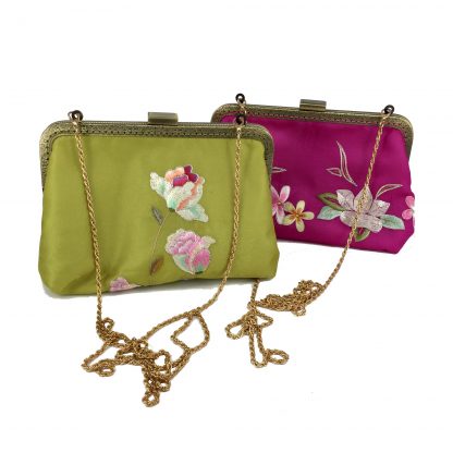 Silk evening bag, decorated with Chinese Silk Brocade hand-stitched silk embroidery flowers outlined with silver thread, available in Fuchsia/Magenta or light Chartreuse Green.